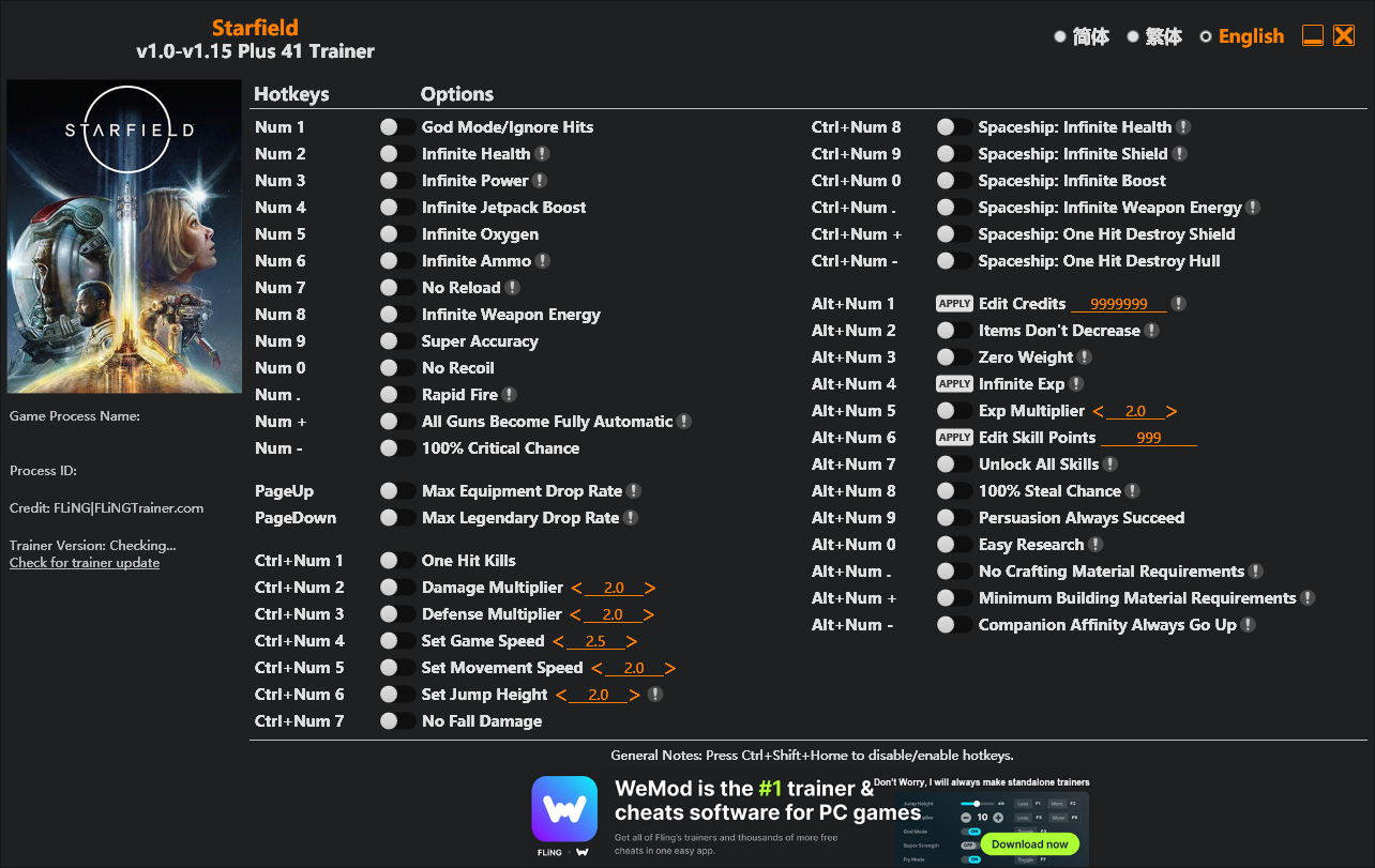 Similar Trainers Starfield Trainer +41 v1.15 {FLiNG}: