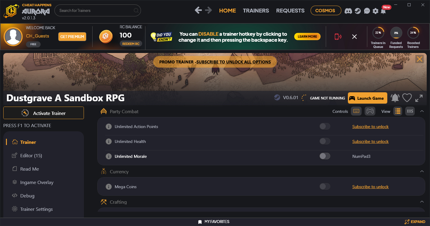 Similar Trainers Dustgrave: A Sandbox RPG Trainer +21 V0.6.01 (Cheat Happens):