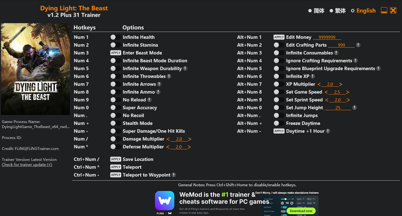 Similar Trainers Dying Light: The Beast Trainer +33 v1.2 {FLiNG}: