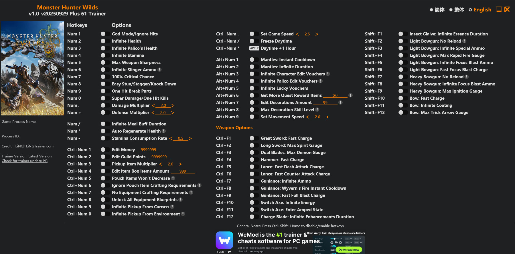 Similar Trainers Monster Hunter Wilds Trainer + 61 v2025.09.29 {FLiNG}: