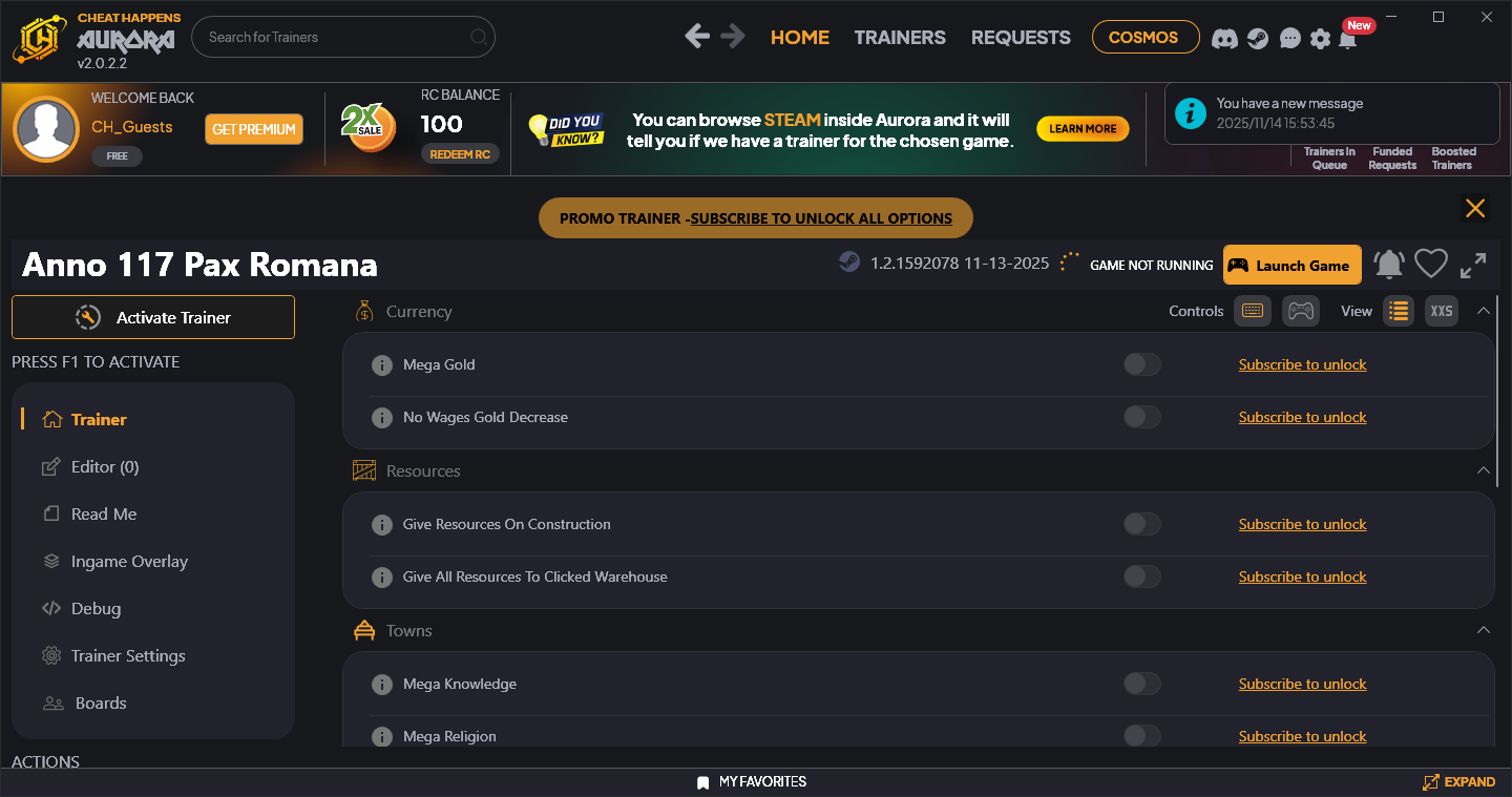 Similar Trainers Anno 117: Pax Romana Trainer +14 v1.2.1592078 (Cheat Happens):