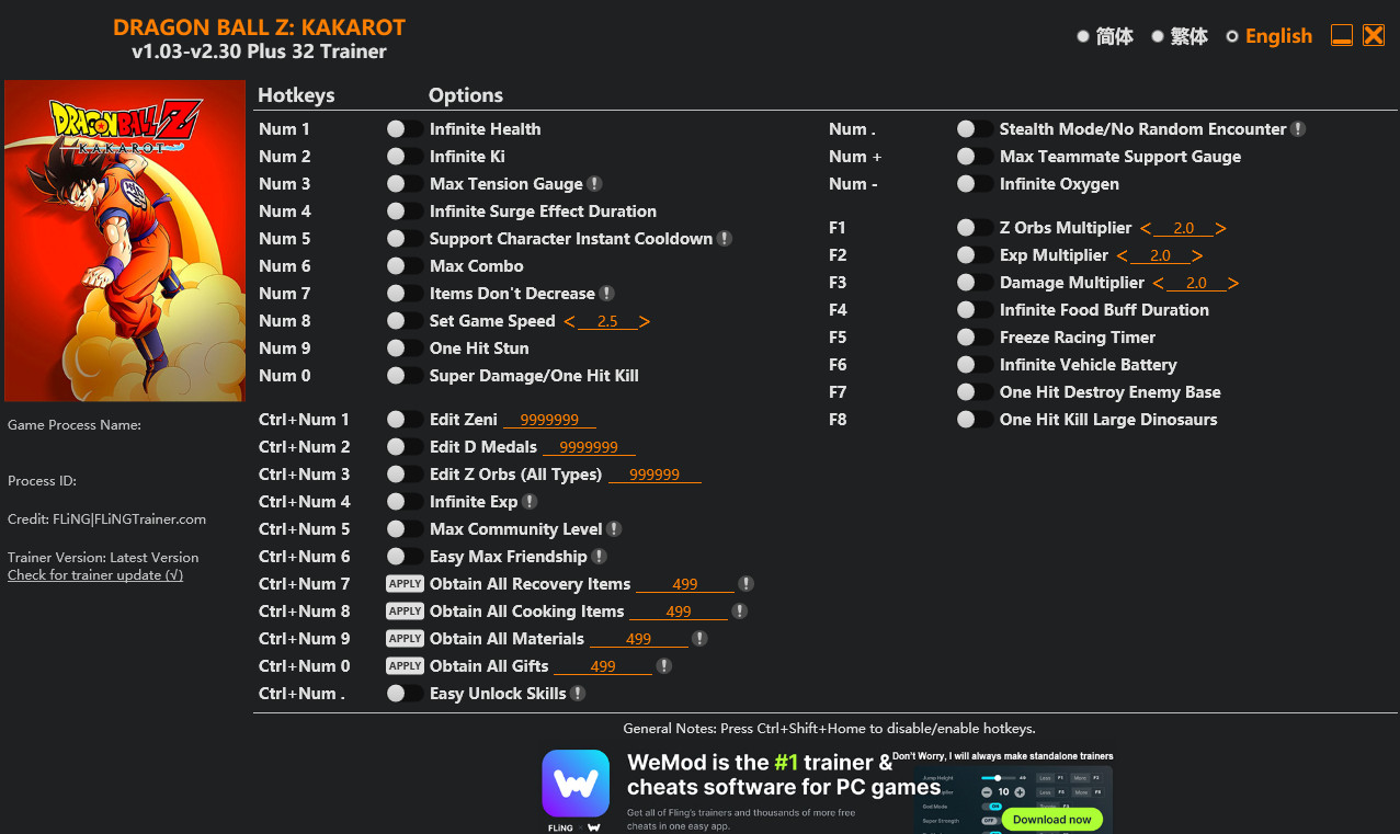 Similar Trainers Dragon Ball Z: Kakarot Trainer + 32 v2.30 {FLiNG}: